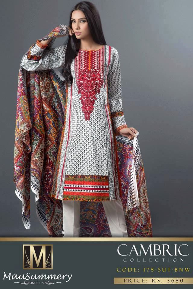 Mausummery Winter Fall Collection 2014-2015 for Women consists of three piece dresses with printed and embroidered kameez, plain shalwar and shawl. These terribly elegant three piece suits with colourful shirts are highlighted by border neck and panel effects. Mausummery cambric winter collection 2014-15 has got the designs for formal and semi-formal wear because of the striking colours and appealed crafts. You can opt these styles for your winter season to bring extra glamour to your looks. These are best stitched Ready To Wear dresses containing lovely patterns and embroideries. The favour of this collection is that it includes smooth and comfortable wool khaddar shawls with delicate versions.These dresses are perfectly persuasive for soothing and charming effect especially the colour scheme is unique and attractive. Usually, these designs are more preferable by young girls.