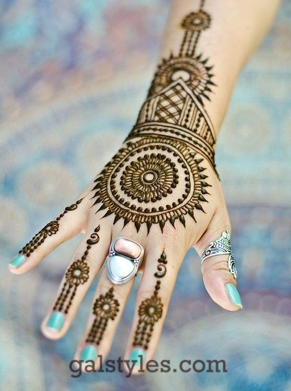 Gol tikki is the most adorable mehandi pattern that never gets old & is highly preferred no matter what. In old times, mostly plain gol tikki was applied but now it has come in more modified form. Fine whorls of flowers now surround the central filling, and the finger designs are kept matched with the tikki design. One can change the outer design of center filling and apply the same pattern on the finger by keeping the other part of hand empty to give more decent and elegant look.